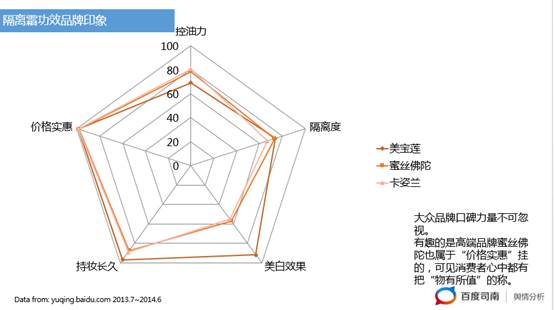 從隔離霜品類口碑分析為例, 美寶蓮、卡姿蘭等大眾品牌在美白效果、隔離度方面都有不遜的口碑;而高端品牌蜜絲佛陀居然屬于“價格實惠”范疇,可見消費者心中都有桿“物有所值”的秤。