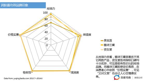 潤膚霜:從控油力來看,雅詩蘭黛顯著優(yōu)于其它兩款產(chǎn)品,資生堂各項指標(biāo)口碑均十分優(yōu)異,可見是極有性價比的控油品牌。而雅詩蘭黛即使定價高昂,在消費者心中依然“價格實惠”,可見“又對又貴”也會讓人心甘情愿買單。