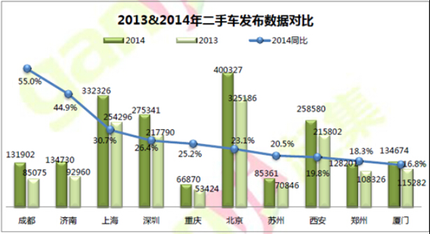 趕集網(wǎng)《2014年二手車行業(yè)分析報告》顯示,2014年成都二手車市場較為活躍,成為換車最頻繁的城市;鄭州、廈門二手車市場則相對低迷。從發(fā)布數(shù)據(jù)的絕對值來看,北京2014年二手車發(fā)布數(shù)據(jù)超過40萬,位列各大城市之首,其次是上海。2014年二手車交易線上渠道占二手車交易總量的40%,以趕集網(wǎng)為首的線上交易平臺滲透率越來越高,成長空間較大。