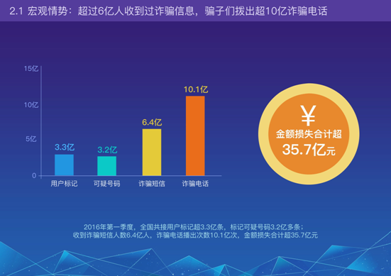 2016年第一季度,全國共接用戶標記超3.3億條,標記可疑號碼3.2億多條;收到詐騙短信人數(shù)6.4億人,詐騙電話撥出次數(shù)10.1億次,金額損失合計超35.7億元。