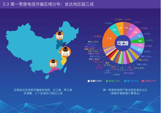報告顯示,第一季度網(wǎng)絡用戶被詐騙金額損失合計超過35.7億元,且電信詐騙區(qū)域多集中在沿海發(fā)達地區(qū),在全國形成的七大詐騙區(qū)域中,分布在兩廣的網(wǎng)絡詐騙分子合計近七成,成本地化發(fā)展模式,導致了多種不同類型詐騙重災區(qū)。