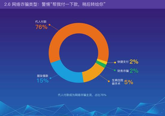 網(wǎng)絡詐騙要錢的主要切入口為“代付款”,詐騙分子會通過盜號或者木馬等手段,用各種理由謊稱現(xiàn)在不方便支付,要求朋友為其代付款,該類型占比高達76%,成為網(wǎng)絡詐騙主流。