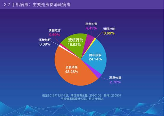 截至2016年3月14日,季度病毒總量:2590105;新增:250507;手機管家都能夠識別并且進行查殺。其中資費消耗類病毒占總數(shù)的48.28%,成為最發(fā)生最普遍的病毒。