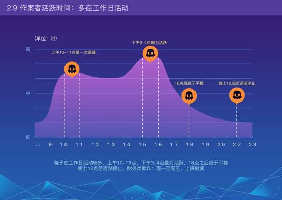 騙子在周一到周五活動較多,尤其涉及公司財務類詐騙,更是集中在周一到周五每天18點以前。電信網(wǎng)絡詐騙每天都可能發(fā)生,騙子的活躍時段為:每天上午10-11點,下午3-4點,18點之后趨于平穩(wěn),晚上10點后逐漸停止。