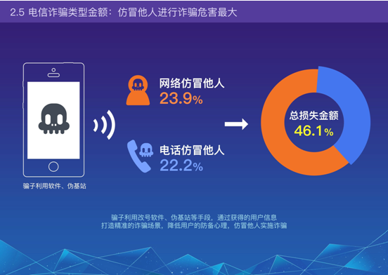 騙子利用改號軟件、偽基站等手段,通過獲得的用戶信息,打造精準的詐騙場景,降低用戶的防備心理,仿冒他人實施詐騙。其中,電話仿冒他人占比23.9%,網(wǎng)絡仿冒他人占比22.2%,合計占總損失金額的46.1%。