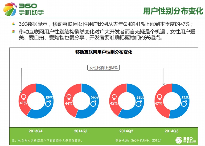 綠皮書數(shù)據(jù)顯示,在過去的四個季度中,中國移動互聯(lián)網(wǎng)用戶的性別比例悄然發(fā)生了變化,女性比例從2013年第四季度的41%上漲至2014年第三季度的47%,移動互聯(lián)網(wǎng)的性別變化無疑將對廣大應(yīng)用開發(fā)者帶來全新的啟示:大量具有女性屬性的自拍、購物、美容、分享類應(yīng)用將大受女性用戶的喜愛。