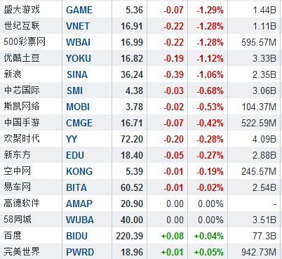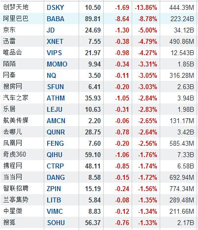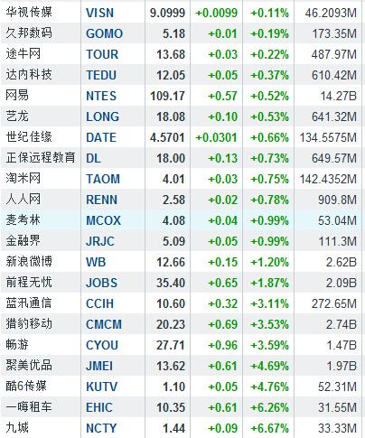 九城漲6.67%,一嗨租車漲6.26%;創(chuàng)夢天地大跌13.86%,京東跌5%。中國概念股周四收盤行情如下: