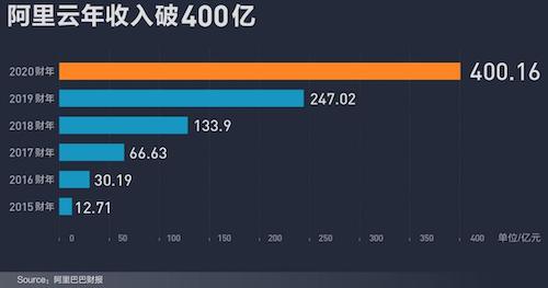 2020財年第四季度內(nèi),阿里云營收達122億元,環(huán)比大幅增長,單季度收入連續(xù)第二個季度突破百億大關(guān)。對比歷史數(shù)據(jù),2015財年阿里巴巴首次披露云計算營收,當年阿里云收入為12.71億元,到2020財年營收400億元,6年間增長31倍。