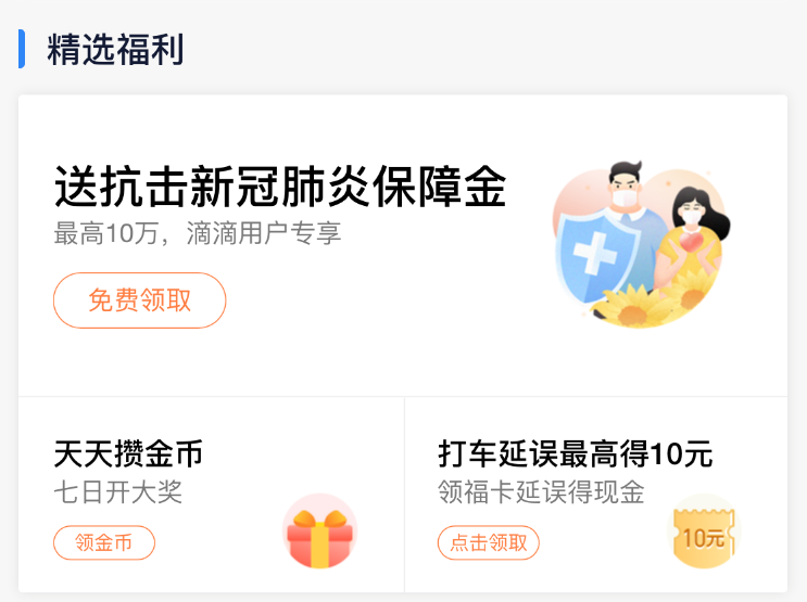 全國用戶均可在滴滴出行APP-金融服務頂部導航欄-精選福利下領取滴滴金融【抗擊新冠肺炎保障】。