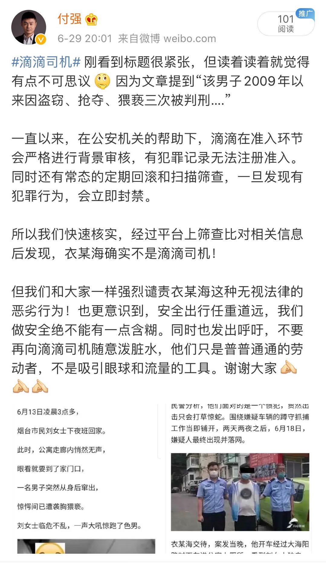 對此,滴滴網(wǎng)約車公司CEO付強發(fā)微博回應(yīng)稱,“經(jīng)過平臺上篩查比對相關(guān)信息后發(fā)現(xiàn),衣某海并非滴滴司機。我們和大家一樣強烈譴責(zé)犯罪嫌疑人,也更意識到安全出行任重道遠(yuǎn),我們做安全絕不能有一點含糊!