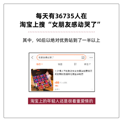 淘寶上的年輕人始終相信愛(ài)情。每天都會(huì)有36735人在淘寶上搜“感動(dòng)哭了”,目的是為了給女朋友買(mǎi)禮物。只是這個(gè)詞下面搜出來(lái)的東西,確實(shí)令人想哭。也許溝通中會(huì)有詞不達(dá)意的時(shí)候,但在淘寶上為你搜的每一個(gè)詞,都是愛(ài)的表現(xiàn)。