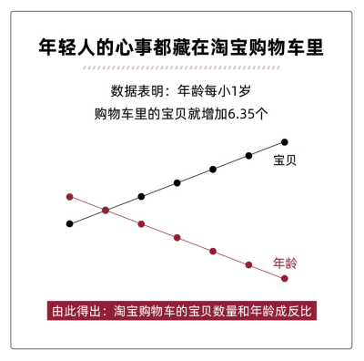 年輕人的心事都藏在了淘寶購(gòu)物車(chē)?yán)。?shù)據(jù)表明,年齡每小1歲,淘寶購(gòu)物車(chē)?yán)锏膶氊惥蜁?huì)增加6.35個(gè)。年輕的時(shí)候總有很多夢(mèng)想,購(gòu)物車(chē)?yán)镅b著的是未來(lái)的藍(lán)圖。