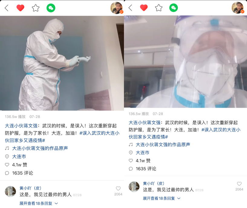 “沒想到我又在自己的家鄉(xiāng),重新穿上了防護服!7月28日,蔣文強在其快手賬號發(fā)布了一條自己身穿防護服的視頻,并配文稱:武漢的時候,是誤入,這次重新穿起防護服,是為了家鄉(xiāng)。