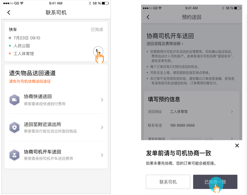 遺失物品送回功能有三種送回方式,分別是協(xié)商快遞送回、送回至附近派出所和協(xié)商司機開車送回。如果乘客遺落物品在車上,在訂單結束后的48小時內(nèi),可根據(jù)自身需求,三種任選。