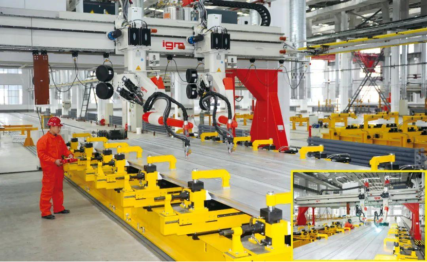 在忠旺集團軌道車體制造車間,工人正在用自動焊接機進行高鐵地板焊接操作。(忠旺供圖 央廣網(wǎng)發(fā))