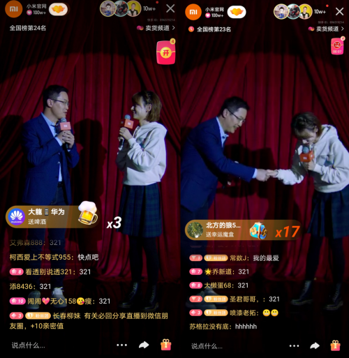 本場直播帶貨創(chuàng)新性地以總裁脫口秀的方式展開,趙曉卉和盧偉冰“師徒”搭檔金句頻出,配合以快手主播白小白的專業(yè)講解,直播間現(xiàn)場氛圍活躍。直到凌晨,“小米官網(wǎng)”直播間還有1.7萬人在線。