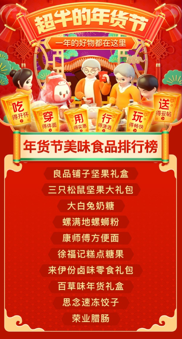 榜單顯示,今年堅果禮盒類仍占據(jù)美味食品主導地位;由于各地倡導“就地過年”,代表“故鄉(xiāng)味道”的家鄉(xiāng)好貨銷量開始大幅增長,與之對應的還有螺螄粉等速食產(chǎn)品備受歡迎;而在“酒水飲料”排行榜中,牛奶產(chǎn)品占據(jù)榜首,年輕人所喜愛的雞尾酒悄然沖進前五。