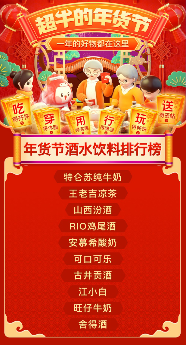 ▲拼多多“年貨節(jié)”酒水飲料排行榜,奶類銷量漲幅131%。