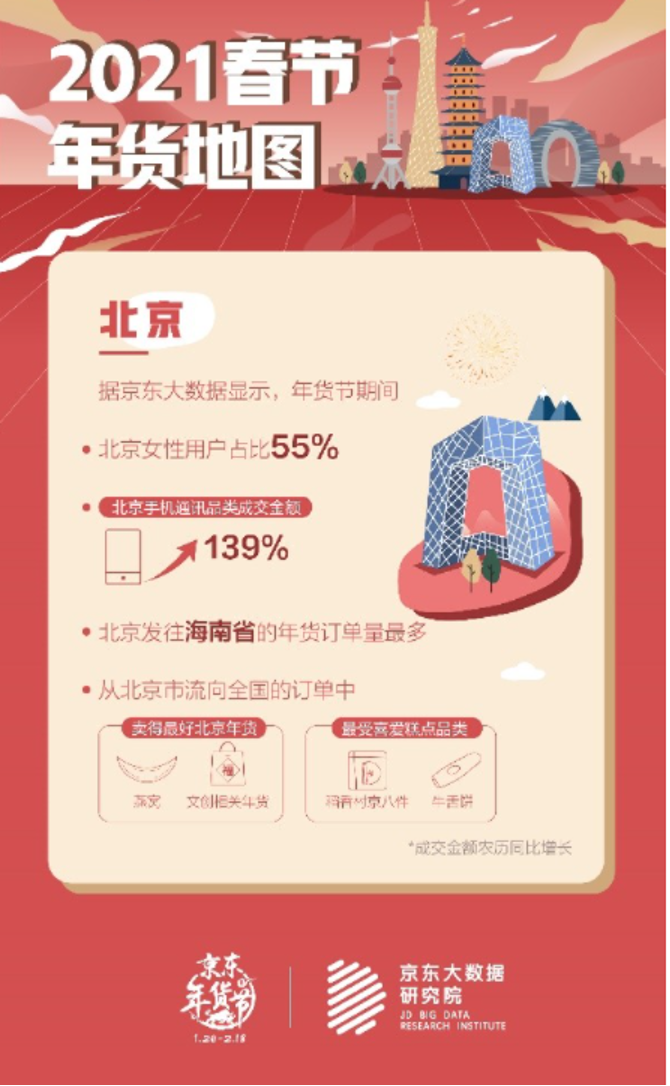 近日,京東大數(shù)據(jù)研究院發(fā)布了《2021年春節(jié)·年貨節(jié)消費趨勢報告》,報告顯示京東異地訂單(用戶下單并發(fā)往非常用所在地)再次火爆,在數(shù)億個家庭間傳遞親人的問候。