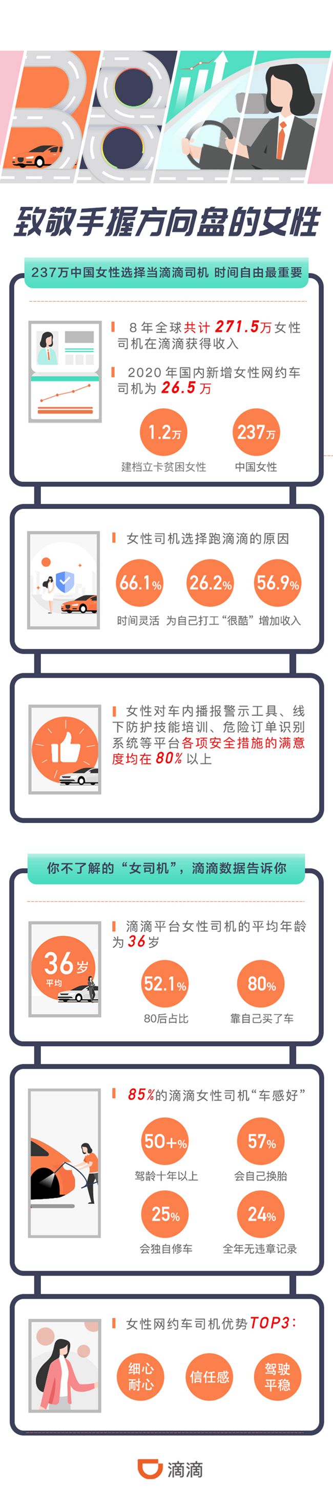 近日,滴滴發(fā)布《2021向上的力量-滴滴數(shù)字平臺與女性生態(tài)研究報告》,報告指出女性選擇開網(wǎng)約車,主要原因的是時間自由,其中66.1%的女性認為“網(wǎng)約車自由度高,可以自己掌握時間”、56.9%的女性認為網(wǎng)約車幫助她們“增加收入”,更有26.2%的女性認為這種“自己給自己打工的工作模式很酷”。