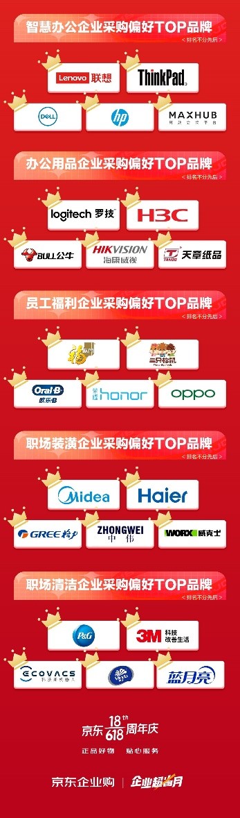 據(jù)京東企業(yè)購數(shù)據(jù),6月1-18日,員工福利綜合品類成交額同比增長184%,其中智能設(shè)備、節(jié)慶福利采購增長迅猛,福臨門、三只松鼠、歐樂B、榮耀、OPPO成為企業(yè)采購員工福利的主要選擇;職場所需生活電器成交額同比增長238%;智慧辦公場景也受到企業(yè)廣泛關(guān)注,會議大屏成交額同比增長112%,顯示器成交額同比增長200%,臺式機成交額同比增長196%,投影儀成交額同比增長5倍,聯(lián)想、ThinkPad、戴爾、惠普、MAXHUB成為備受中小企業(yè)關(guān)注的智慧辦公品牌。而對于職場環(huán)境,企業(yè)也通過裝潢煥新、采購辦公家具等方式為員工創(chuàng)造更舒適的辦公環(huán)境,職場裝潢綜合品類成交額同比增長151%,更多企業(yè)偏好采購美的、海爾、格力、中偉、威克士的產(chǎn)品來提升和改善職場環(huán)境。