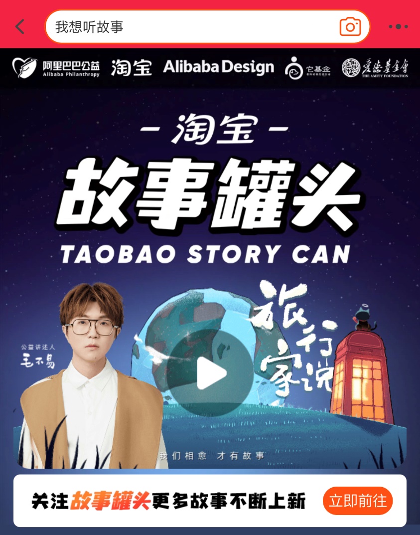 “聽說遠(yuǎn)方,最神秘的角落,每晚都燃起篝火……”,在淘寶搜索“我想聽故事”,用戶將進(jìn)入到一個(gè)叫做“故事罐頭”的板塊,聽到歌手毛不易講述的一則關(guān)于主人和寵物的故事。