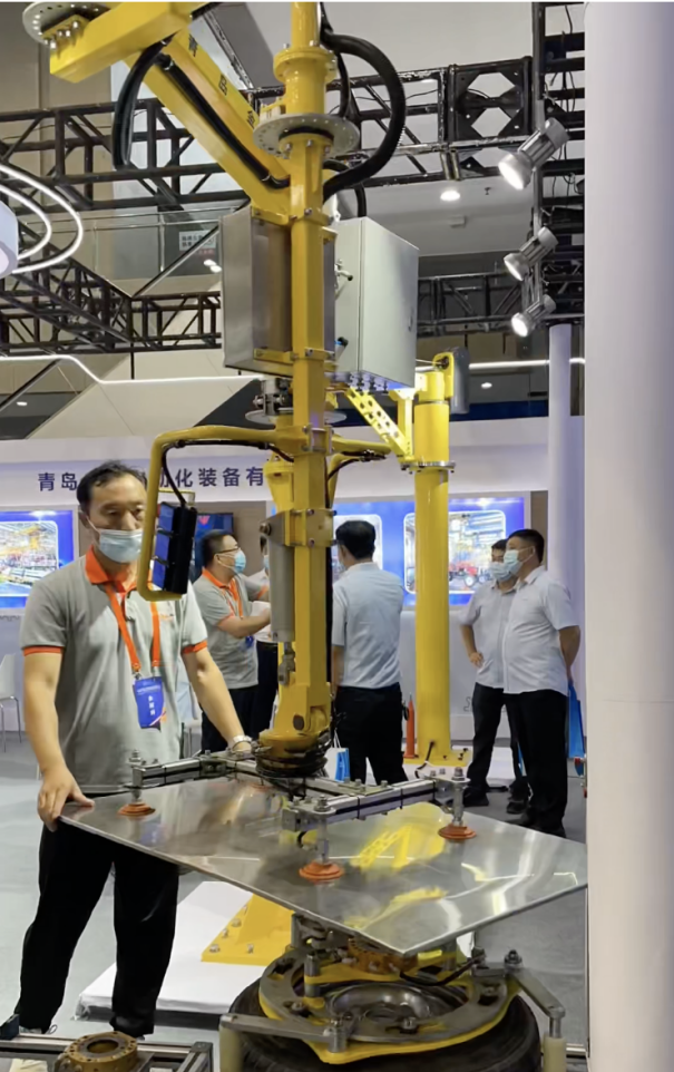 “一個(gè)小姑娘就可以輕松提起幾十公斤的重物”,熙熙攘攘的人群正在體驗(yàn)的是青島金海自動(dòng)化的助力機(jī)械臂產(chǎn)品。圖中的工作人員正在演示機(jī)械臂吸起工件的操作步驟。