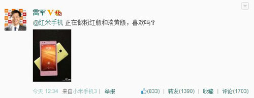 雷軍微博透露紅米手機(jī)將推出粉紅版和淡黃版