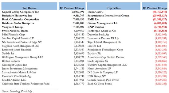 在多頭一方,領(lǐng)軍者是Capital Group Companies,一季度增持3210萬(wàn)股。其次是巴菲特旗下的伯克希爾哈撒韋公司,一季度增持980萬(wàn)股;美國(guó)銀行、高盛以及美國(guó)先鋒集團(tuán)緊隨其后。