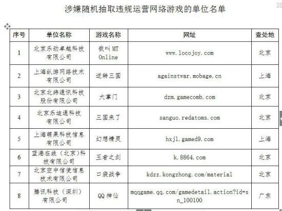 二、接群眾舉報,經(jīng)初步核查,北京樂動卓越科技有限公司(游戲名稱:《我叫MT Online》)、上?v游網(wǎng)絡(luò)技術(shù)有限公司(游戲名稱:《逆轉(zhuǎn)三國》)等8家單位,涉嫌違反《辦法》第18條的規(guī)定,在運(yùn)營網(wǎng)絡(luò)游戲過程中以隨機(jī)抽取等偶然方式,誘導(dǎo)網(wǎng)絡(luò)游戲用戶采取投入法定貨幣或網(wǎng)絡(luò)游戲虛擬貨幣方式獲取網(wǎng)絡(luò)游戲產(chǎn)品和服務(wù),請相關(guān)文化市場綜合行政執(zhí)法機(jī)構(gòu)核實(shí)情況,并責(zé)令違規(guī)單位于2013年12月31日前整改完畢,逾期仍未整改的應(yīng)依法予以查處。