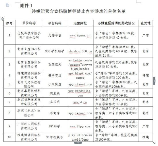 一、經(jīng)初步核查,優(yōu)視科技有限公司廣州分公司(平臺名稱:“九游平臺”)、北京奇虎360科技有限公司(平臺名稱:“360手機(jī)助手”)等10 家單位(見附件1),在其手機(jī)游戲平臺上運(yùn)營多款含“賭場”字樣、扎金花類、梭哈類、六合彩類游戲,涉嫌違反《辦法》第9條的規(guī)定及《公安部、信息產(chǎn)業(yè)部、文化部、新聞出版總署關(guān)于規(guī)范網(wǎng)絡(luò)游戲經(jīng)營秩序查禁利用網(wǎng)絡(luò)游戲賭博的通知》(公通字〔2007〕3號)的要求,含宣揚(yáng)賭博等禁止內(nèi)容,請相關(guān)文化市場綜合行政執(zhí)法機(jī)構(gòu)核實(shí)情況,并責(zé)令違規(guī)單位于2013年12月31日前整改完畢,逾期仍未整改的應(yīng)依法予以查處。