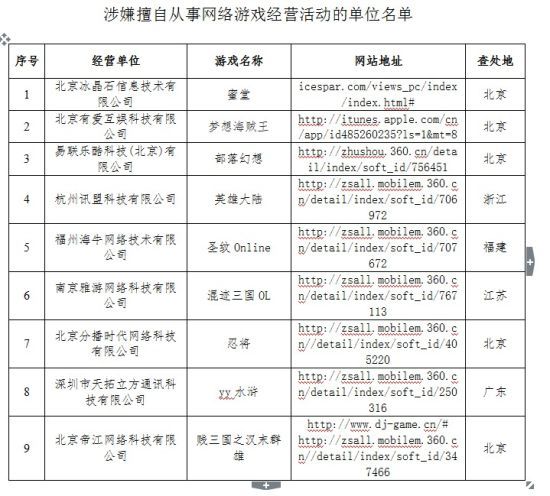 未經(jīng)批準(zhǔn)擅自從事手機(jī)網(wǎng)絡(luò)游戲的經(jīng)營活動企業(yè)名單