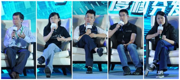 “金熊掌獎(jiǎng)”圓桌會(huì)嘉賓從左到右依次是:百度投資并購部執(zhí)行總監(jiān)方益民、創(chuàng)新工場合伙人郎春暉、百度移動(dòng)分發(fā)事業(yè)部副總經(jīng)理熊振、親寶寶CEO馮培華、波羅蜜全球購App市場負(fù)責(zé)人雷婷婷