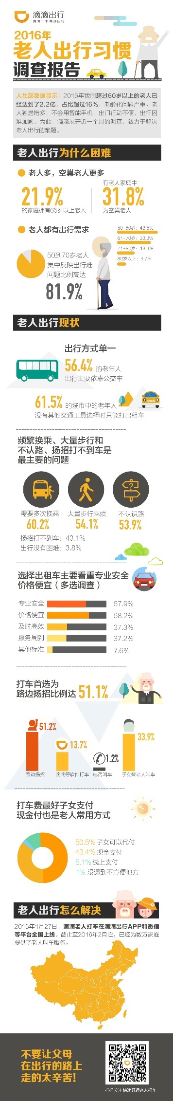 隨著我國人口老齡化加劇,養(yǎng)老成為與收入、醫(yī)療、住房等并列的重大民生問題。為了解老年人出行習(xí)慣、更好地滿足老年人的出行需求,滴滴出租車展開了為期一月的問卷調(diào)查,并最終發(fā)布《2016年老人出行習(xí)慣調(diào)查報告》。報告顯示,50到70歲老人更容易覺得面臨出行難問題,有近兩成被調(diào)查老人在遇到出行難題時會放棄出行。