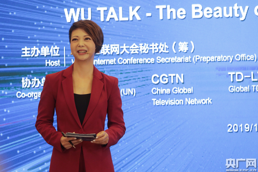 第一場(chǎng)圓桌對(duì)話的主題為:面向未來——互聯(lián)網(wǎng)的下一個(gè)五十年,圖為來自中央廣播電視總臺(tái)CGTN的主持人田薇。