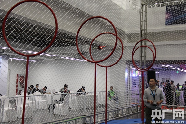 央廣網(wǎng)記者來到無人機(jī)比賽展區(qū),麻繩編織的網(wǎng)將場(chǎng)地完全罩住,以免無人機(jī)意外飛出場(chǎng)地,F(xiàn)場(chǎng)的參賽選手技術(shù)十分精湛,無人機(jī)順利通過一個(gè)又一個(gè)障礙。