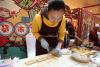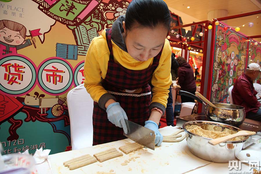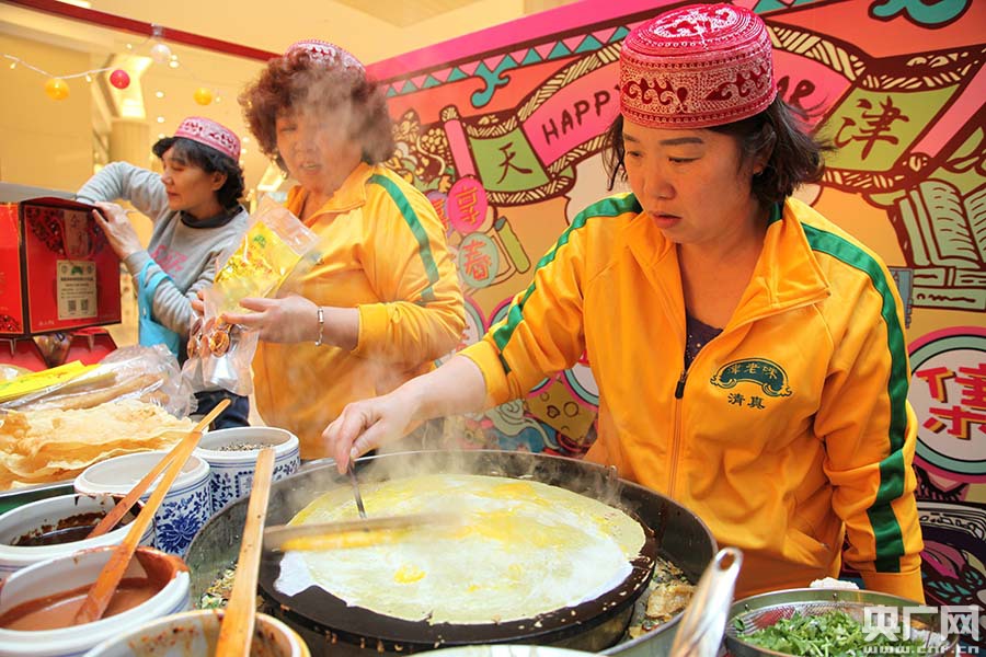 在現(xiàn)場的天津傳統(tǒng)小吃中,不僅有大家耳熟能詳?shù)慕蚶衔都屣灩印⒐鸢l(fā)祥十八街麻花、糖畫藝術(shù)還有天津茉莉花茶、祥禾餑餑糕點(diǎn)、姜氏熟梨糕、容記油鹵、妙眾堂黑豆茸、至美齋醬牛肉、恩順德小李燒雞、芝蘭齋糕干、馬氏傳統(tǒng)熬糖等,紛紛在場進(jìn)行制作及加工,為津城市民帶來一場味覺的饕餮盛宴。圖為津老味煎餅果子(褚夫晴/攝) -