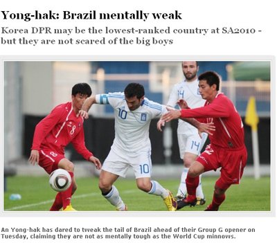 2010年6月13日,雖說神秘之師朝鮮隊時隔44年再戰(zhàn)世界杯,但是面對媒體他們卻是異常的高調。根據意大利媒體《C4》消息稱:“朝鮮中場悍將安英學表示絕對能夠重創(chuàng)巴西隊,因為朝鮮隊在精神上比桑巴軍團要頑強很多!