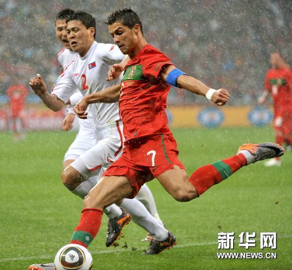 6月21日,葡萄牙隊球員克·羅納爾多(右)在比賽中帶球突破。當日,在開普敦舉行的2010南非世界杯足球賽G組第二輪比賽中,葡萄牙隊以7比0戰(zhàn)勝朝鮮隊。新華社記者徐速繪攝
