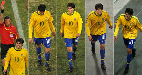 6月21日,與科特迪瓦的比賽,鄧加并沒有將卡卡從首發(fā)名單中拿下,顯然巴西10號也用兩次助攻來回報主帥的信任。然后戲劇性的一幕發(fā)生在比賽臨近結束時,卡卡在第85分鐘和第88分鐘連續(xù)吃到黃牌被罰出場。當主裁判高高舉起紅牌時,無數(shù)球迷通過電視轉播的鏡頭看著卡卡微笑著走下場……只是電視機前的觀眾都沒有看到卡卡走出球場時表情。桑巴王子英俊的面容從笑臉變成了沮喪,沒有人看到他落淚,但是卡卡抽泣的一幕還是被攝像機捕捉到了。