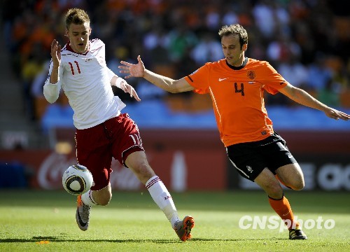 北京時(shí)間6月14日19:30(南非當(dāng)?shù)貢r(shí)間13:30),第19屆世界杯E組第一輪一場(chǎng)比賽在約翰內(nèi)斯堡的足球城球場(chǎng)展開(kāi)角逐,荷蘭2比0力克丹麥。第46分鐘,范佩西傳中,西蒙-鮑爾森頭球頂在阿格后背上折射破網(wǎng),轉(zhuǎn)入自家大門(mén),打出本屆世界杯第一記烏龍球。 中新社發(fā) 廖攀 攝