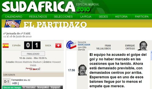 整場比賽,西班牙占據(jù)了場上的主動,但是卻在比賽進(jìn)行到第52分鐘,被瑞士球員費(fèi)爾南德斯補(bǔ)射破門,這也是本場比賽的唯一進(jìn)球,也幫助瑞士隊在最終1-0戰(zhàn)勝西班牙隊!恶R卡報》的評論員說到:這是一場震撼人心的比賽,西班牙在獲得不少機(jī)會的情況下卻沒有能夠破門。我們把過多精力投放在中路,這也可容易被對手所知曉。我們希望能夠打進(jìn)一球,即使一個平局也是可以的,F(xiàn)在一切都變得困難起來。