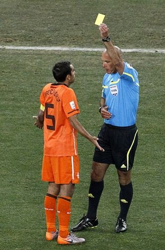 然而,決賽遠(yuǎn)比荷蘭隊(duì)想象的艱苦。為了限制西班牙隊(duì)的控球戰(zhàn)術(shù),荷蘭隊(duì)多次采用兇狠的鏟搶破壞對手的傳球和進(jìn)攻。為此,他們付出了多張黃牌的代價(jià)。作為荷蘭隊(duì)場上隊(duì)長,同時(shí)也是后防中堅(jiān),范布隆克霍斯特在場上極具大將風(fēng)范。在指揮隊(duì)友站位的同時(shí),與拉莫斯的對位防守更是滴水不漏,基本沒有給皇馬球星太多助攻的機(jī)會。防守動作過大,就不免吃牌。第54分鐘,范布隆克霍斯特就由于犯規(guī)吃到了一張黃牌。
