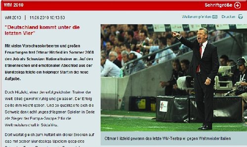 中廣網(wǎng)北京6月12日消息 北京時間6月12日,瑞士隊主教練希茨菲爾德接受了德甲聯(lián)賽官網(wǎng)的獨家采訪。前拜仁名帥認(rèn)為盡管缺少了巴拉克的德國隊依然可以打進(jìn)半決賽,希茨菲爾德同時堅信瑞士隊有足夠的實力進(jìn)入淘汰賽階段。