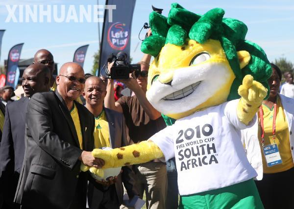 4月21日,南非總統(tǒng)祖馬(前左)與南非世界杯吉祥物豹娃“扎庫米”握手。當(dāng)日,在世界杯倒計(jì)時(shí)50天之際,南非北開普省金伯利市舉行了盛大的慶;顒(dòng),南非總統(tǒng)祖馬和南非世界杯組委會(huì)官員等參加了慶;顒(dòng)。新華社發(fā)(梁銓攝)