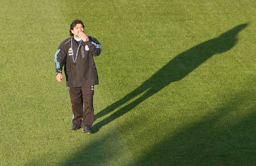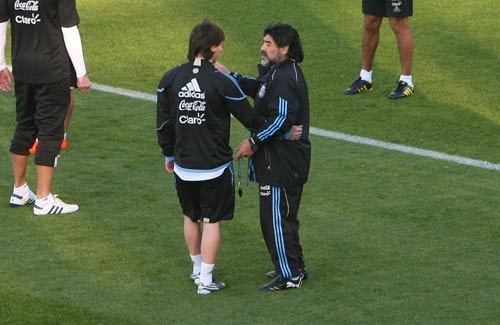 當(dāng)?shù)貢r(shí)間6日下午,馬拉多納率領(lǐng)的阿根廷隊(duì)在比勒托利亞大學(xué)Hatfield球場(chǎng)進(jìn)行了公開(kāi)訓(xùn)練。進(jìn)場(chǎng)后,老馬架不住現(xiàn)場(chǎng)球迷的呼喊,兩度獻(xiàn)出飛吻。而在訓(xùn)練前,馬拉多納專(zhuān)門(mén)找到梅西,對(duì)他叮囑了幾句。
