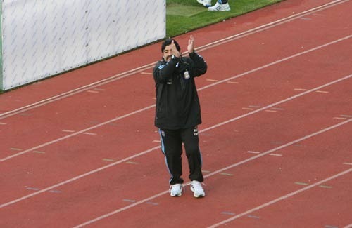 4點(diǎn)15分,馬拉多納走進(jìn)球場(chǎng),全場(chǎng)球迷齊聲大喊他的名字,與梅西不同的是,聽(tīng)到球迷的呼喊,老馬不僅向球迷招手還邊走邊獻(xiàn)上飛吻。隨后,馬拉多納走到梅西面前對(duì)他面授機(jī)宜,兩人談?wù)摿舜蠹s半分鐘。之后,老馬將全體隊(duì)員召集到中圈進(jìn)行布置,大約2分鐘后,老馬宣布訓(xùn)練開(kāi)始,隊(duì)員們進(jìn)行準(zhǔn)備活動(dòng)。在此過(guò)程中,馬拉多納在場(chǎng)邊走來(lái)走去,走近看臺(tái)時(shí),球迷們?cè)俅舜蠛八拿郑像R停下來(lái)向球迷招手,又一次獻(xiàn)上飛吻。(記者呂長(zhǎng)偉)