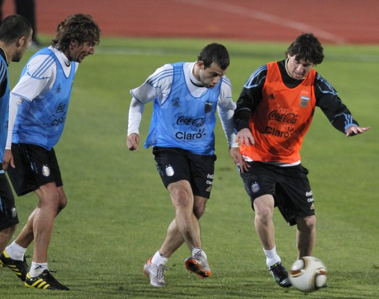 阿根廷隊(duì)訓(xùn)練備戰(zhàn)世界杯 兩代球王交鋒