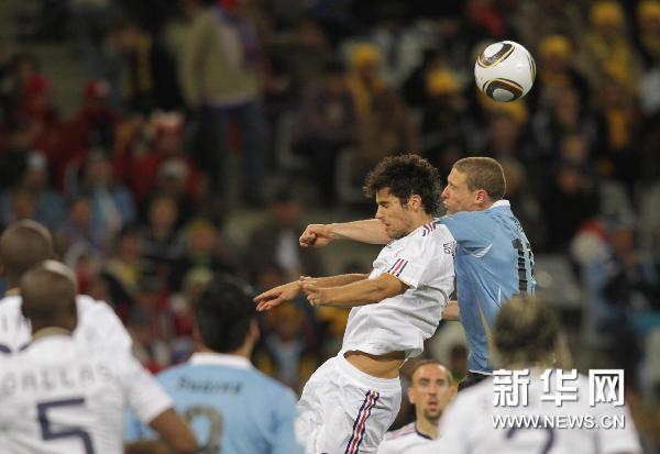 6月11日,法國(guó)隊(duì)球員古爾庫(kù)夫(上左)與烏拉圭隊(duì)球員迭·佩雷斯(上右)爭(zhēng)頂。當(dāng)日,在2010南非世界杯A組第二場(chǎng)比賽中,烏拉圭隊(duì)與法國(guó)隊(duì)以0比0戰(zhàn)平。新華社記者邢廣利攝