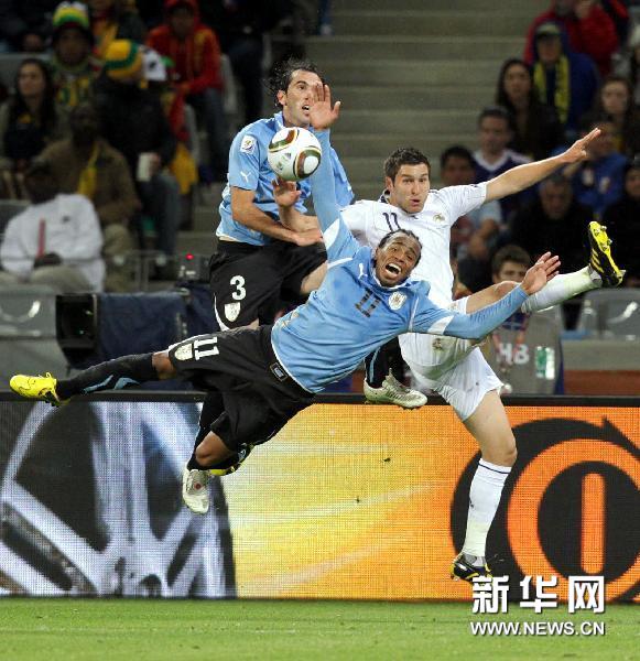 6月11日,法國(guó)隊(duì)球員吉尼亞克(右)與烏拉圭隊(duì)球員阿·佩雷拉(下)、迭·戈丁拼搶。當(dāng)日,在2010南非世界杯A組第二場(chǎng)比賽中,烏拉圭隊(duì)與法國(guó)隊(duì)以0比0戰(zhàn)平。新華社記者邢廣利攝